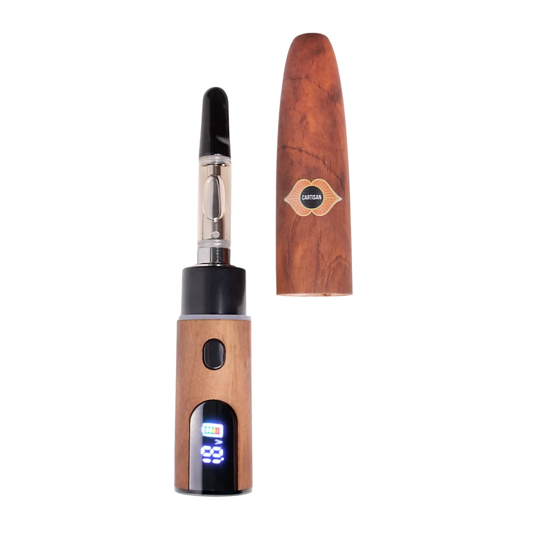 The Cartisan Cochiba is a cigar-style 510-thread concealer battery designed to hold a compatible 510 cartridge inside a cigar-shaped body. It includes a built-in 400mAh battery, a digital screen for voltage and battery status, and a magnetic cover to keep the cartridge enclosed.
