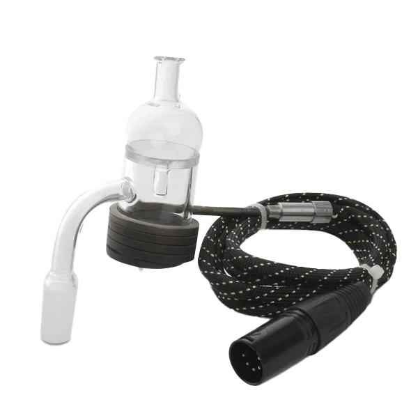 This kit is a mains-powered, temperature-controlled e-nail setup built around a PID controller and a round coil designed to heat an included thick-wall quartz banger. It is offered in 25mm or 30mm sizing and is intended for stationary, home-use setups with a 220V UK plug.